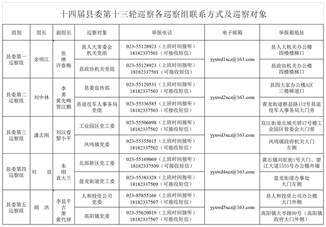 巡察期間,巡察組開(kāi)通了舉報(bào)電話(huà)和電子郵箱,設(shè)置了舉報(bào)箱,歡迎廣大黨員、干部、群眾反映上述方面的有關(guān)情況和問(wèn)題。對(duì)不屬于巡察組受理的信訪(fǎng)問(wèn)題,將按規(guī)定轉(zhuǎn)相關(guān)部門(mén)處理。巡察組聯(lián)系方式及巡察對(duì)象詳見(jiàn)附表,巡察組受理信訪(fǎng)舉報(bào)截止時(shí)間為2020年12月10日18時(shí)。