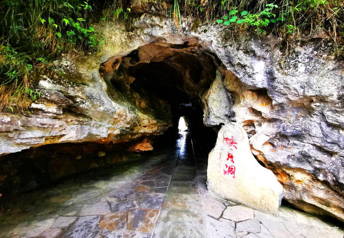 映月洞位于龍缸東北100m處的懸崖峭壁之中,為第一層溶洞。洞長43m,走向為25°南洞口高3.9m,直徑3.4m,北洞口高2.2m,北端為暗河的出口,可見由流水形成的槽谷,洞頂可見有少許的石鐘乳及鈣華,中部靠南端還見有水滴沿石鐘乳滴下,在地下形成一個深約50cm的匯水凹坑。 每一年的中秋之夜,月亮從東方升起不久,月光充盈了整個洞身,集束的銀光就像手電一樣,由北向南穿洞射出,人們把這一奇特的景觀叫做“穿洞映月”。