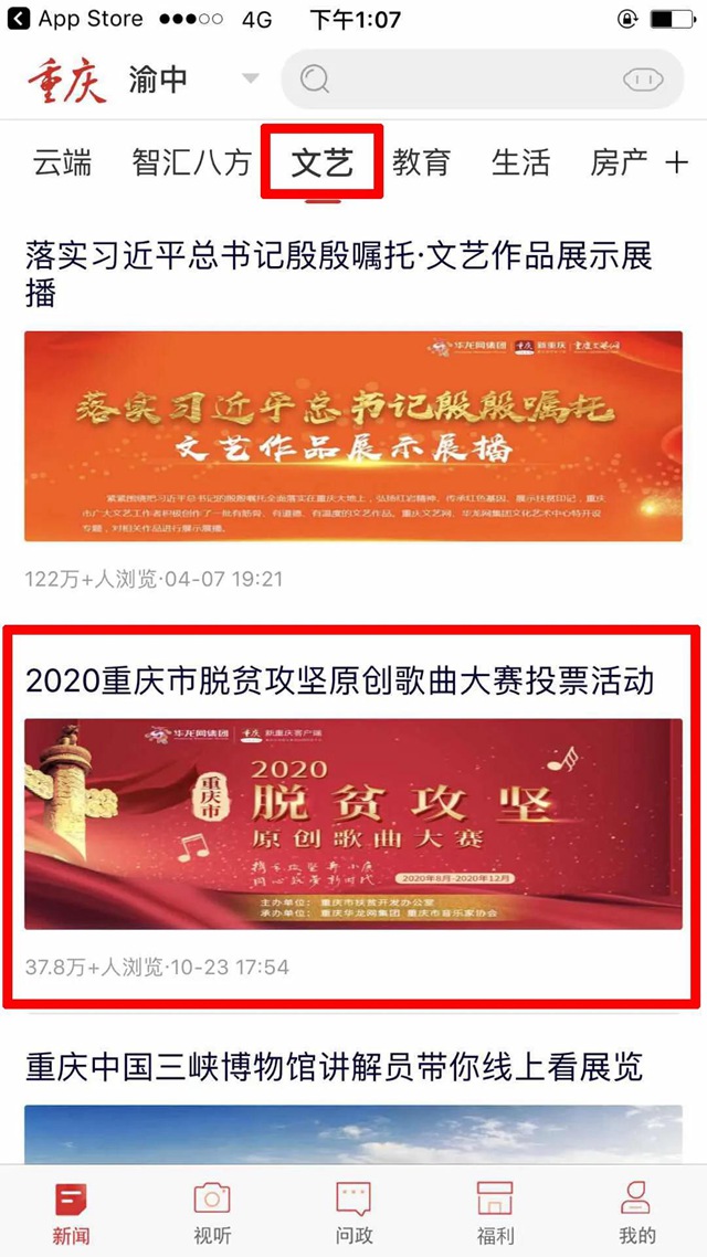 方法二:下載“新重慶”app,注冊并登錄。進入“文藝”欄目,找到“2020重慶市脫貧攻堅原創(chuàng)歌曲大賽投票活動”(或直接在“新重慶”app搜索欄搜索)。