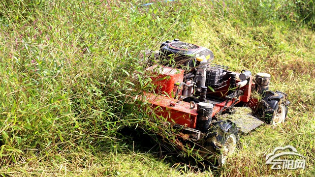 一輛遙控割草機在工作人員的操作下,靈活地穿梭在果園林間,林中的雜草一片片被放倒。這款割草機是專門針對果園開發的除草農機新型產品,每小時能完成割草2600余平方米。