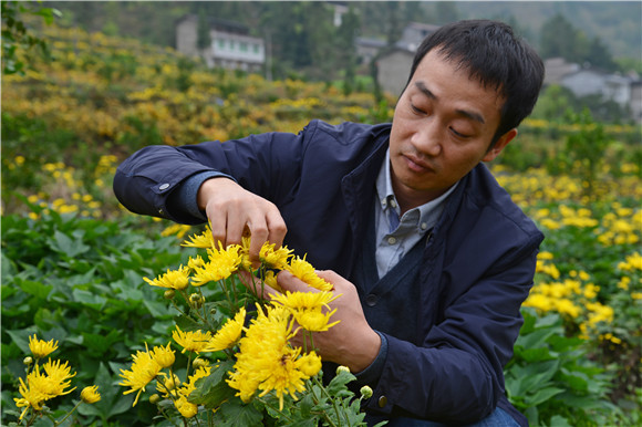 勝利村便民服務(wù)中心的旁邊是大片花田,村民們正在采摘黃色的菊花。