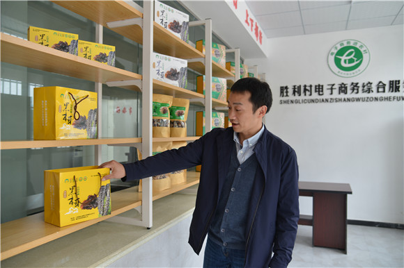 在村支部樓下的展示室,木耳包裝盒格外醒目,一起打包成盒的還有金絲黃菊,這些都是勝利村的“硬貨”。