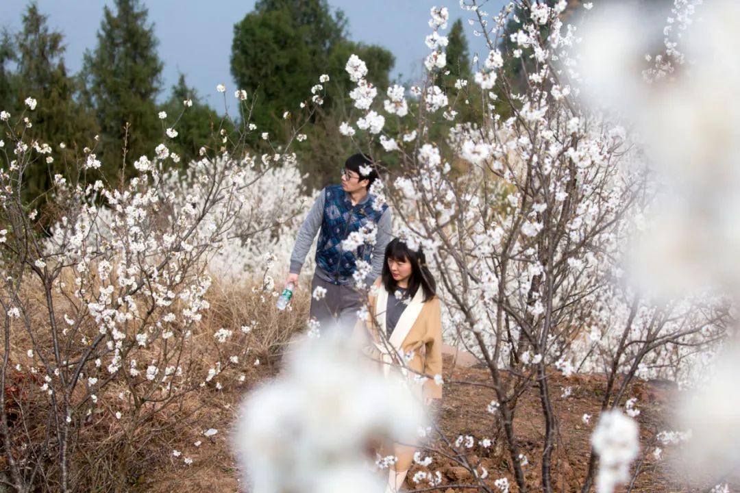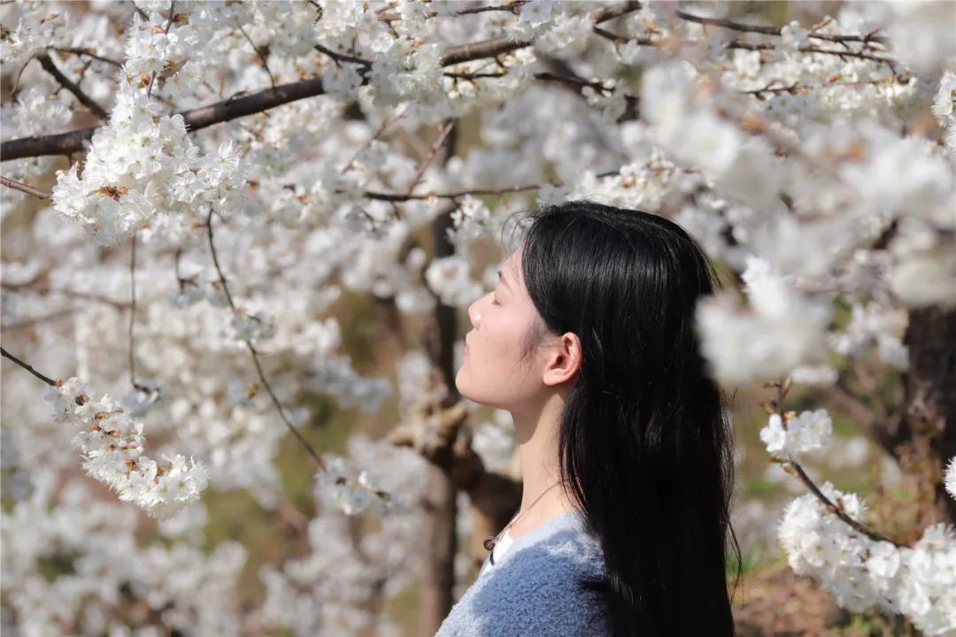 沿櫻桃園步行小道走進(jìn)花叢深處