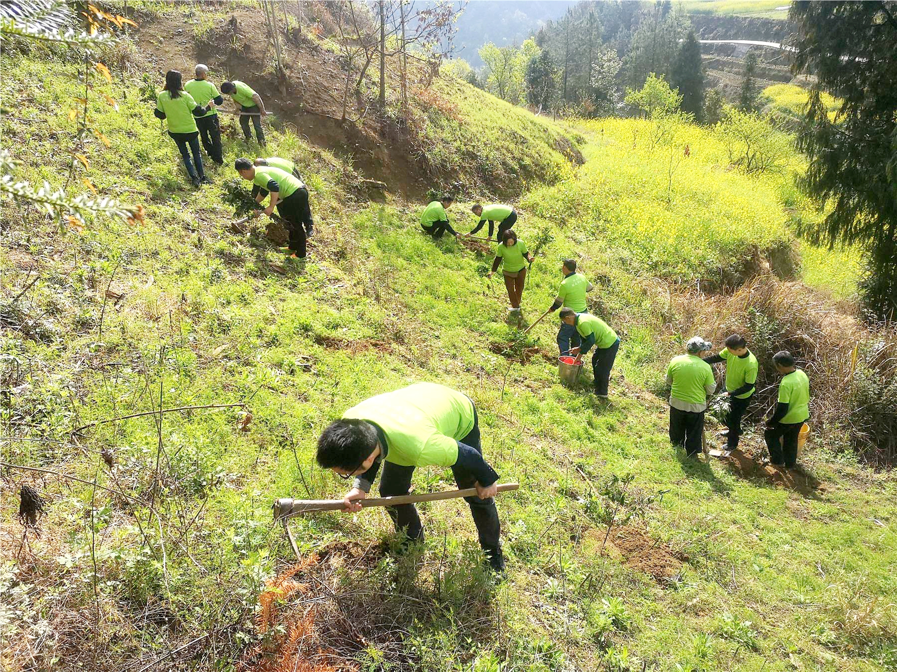 活動現場,大家分工合作,熱情高漲。搬運樹苗、挖坑、扶苗、填土、澆水,各個環節有條不紊,處處都是忙碌的身影。經過一番辛勤勞作,800株山胡椒苗木挺立在山坡上。