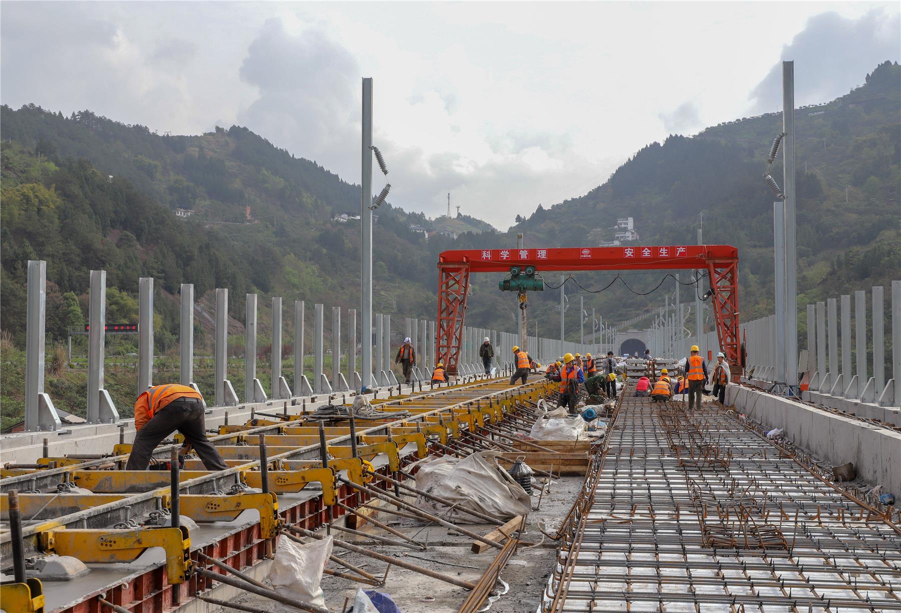 在鄭萬高鐵云陽段二分部的施工現場,記者了解到該分部所承擔的工程建設推進順利。其中,永利隧道已完成道床板施工,譚家河雙線特大橋已完成底座板施工,小周隧道正安裝扣件,巴陽隧道道床板施工、扣件安裝進度過半。
