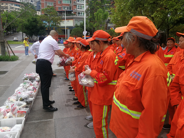 云陽網訊(實習生 黃美琪 實習生 吳孟軒)6月11日,縣城管局、徐工集團聯合愛心企業綠康食品為城區的環衛工人送上了粽子、節日慰問品等愛心物資,讓在烈日下辛勤工作的“城市美容師”吃上了新鮮的粽子,并送上了節日的祝福和問候。參加活動的有縣城管局副局長羅倫、徐工集團領導丁鴻飛、城管局環衛所負責人及所有環衛工人等共計700余人。