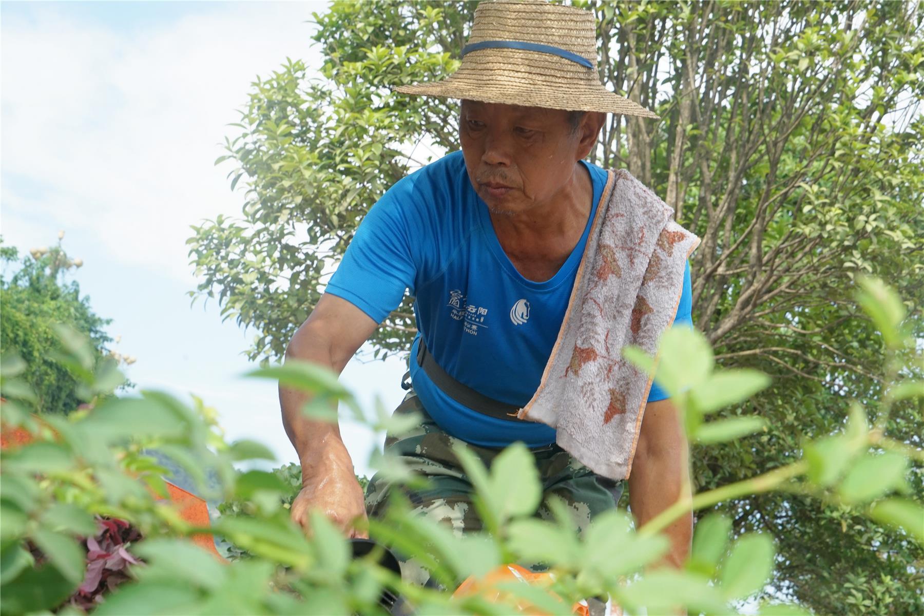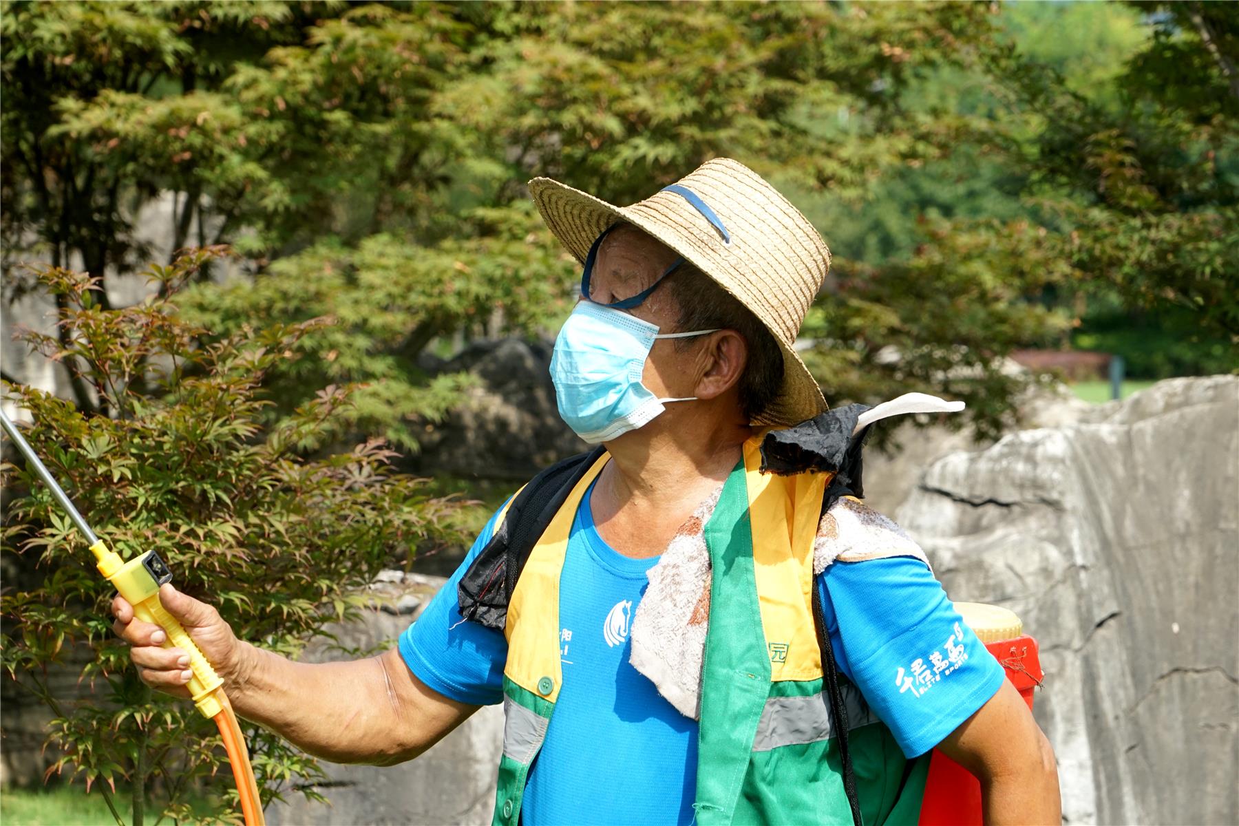 7月20日下午3點,在亮得晃眼的烈日下,月光草坪附近一臺除草設(shè)備“隆隆”作響,近50歲的王成剛熟練地拿著工具,不停地修剪灌木、除雜草。他給綠植噴撒農(nóng)藥,臉頰上的汗珠也跟著大顆大顆地往下滴,淡藍色的短袖和搭在肩上的毛巾早已被汗水侵濕。