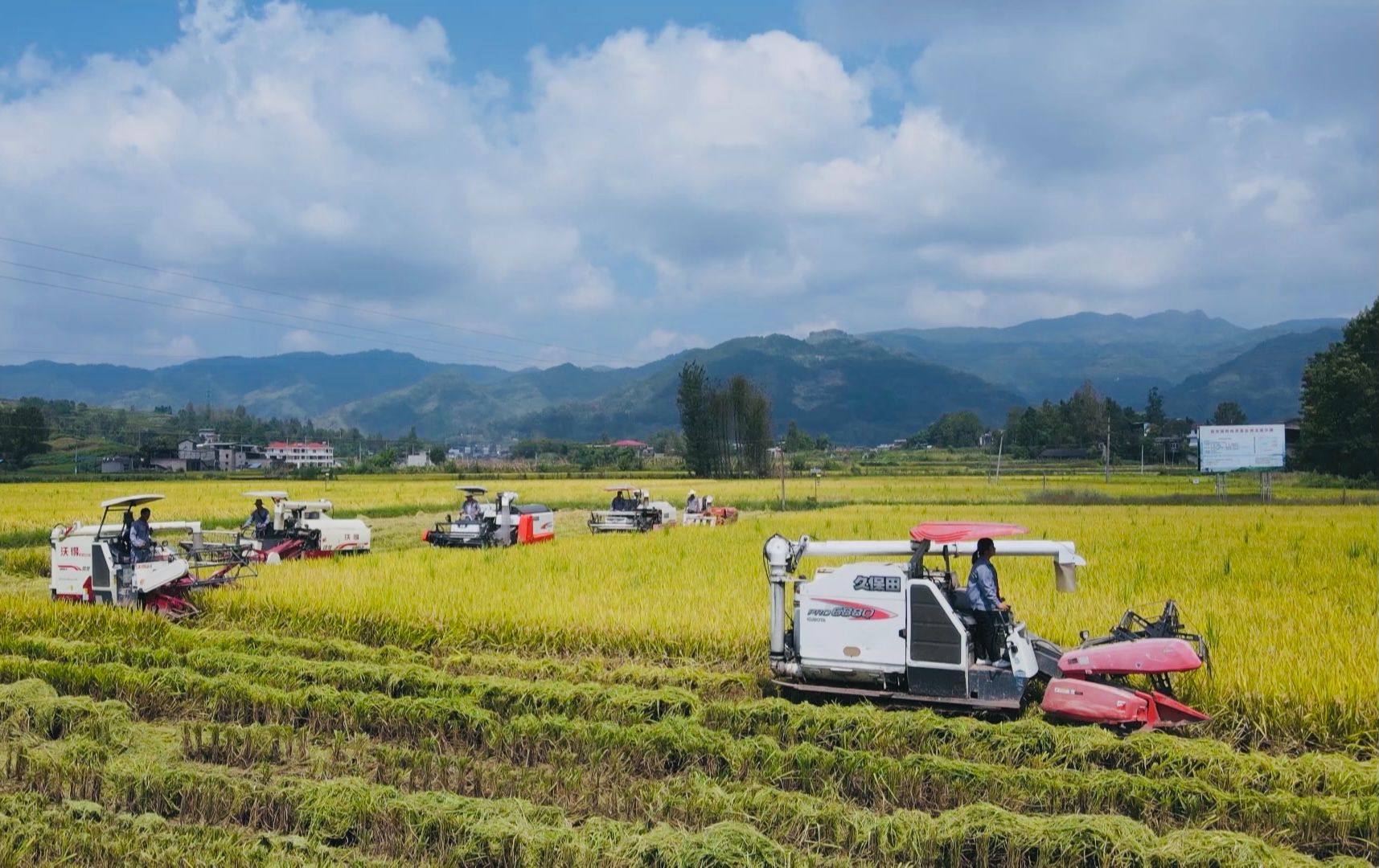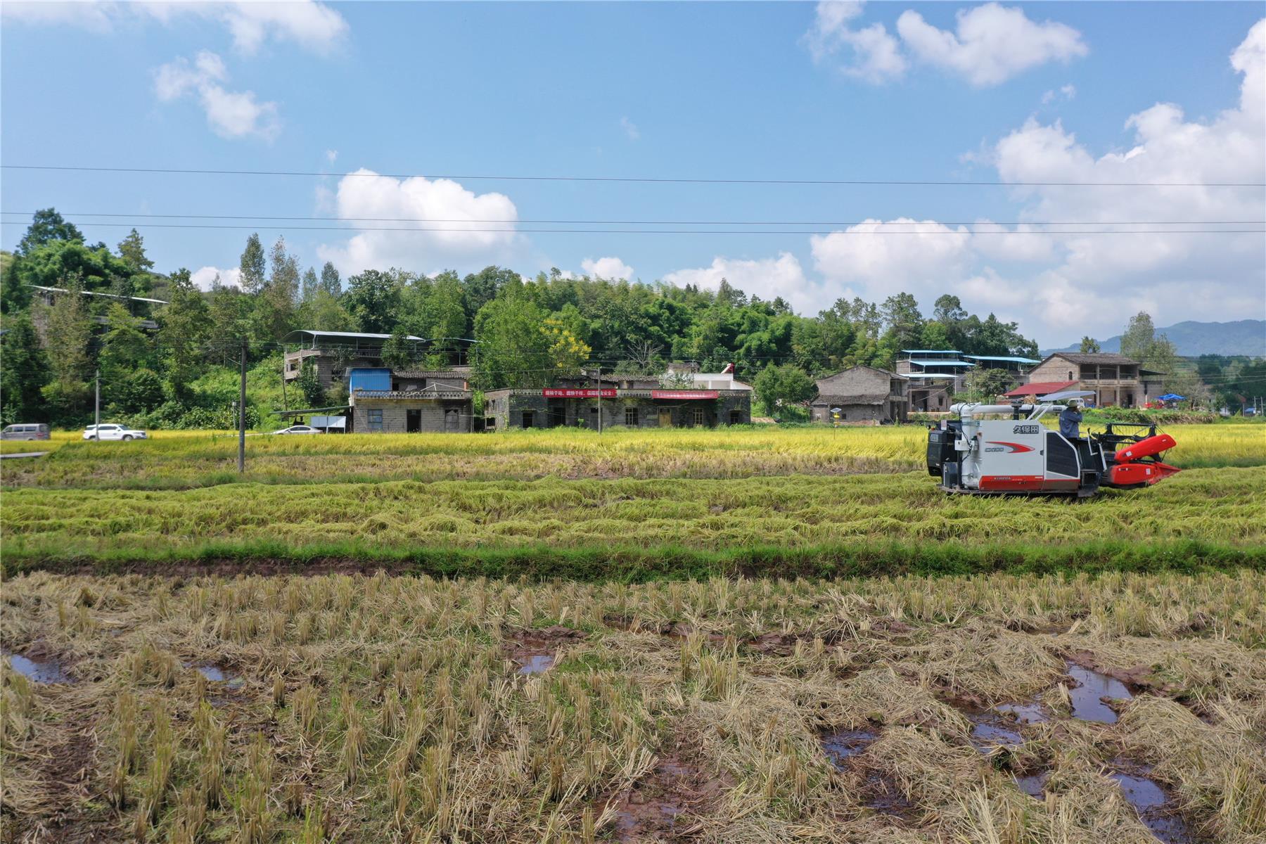 伴著喜氣洋洋的鑼鼓聲和高高飛揚(yáng)的空飄,路陽鎮(zhèn)水稻開鐮儀式舉行。在人們期盼的目光中,一字排開的8臺(tái)大型收割機(jī)正駛向稻田。藍(lán)天白云下,金燦燦的稻田美如畫卷。伴隨著機(jī)器轟鳴聲,機(jī)手們駕駛著收割機(jī)開足馬力穿梭在金色的田野中,沉甸甸的稻穗兒被收入袋中。