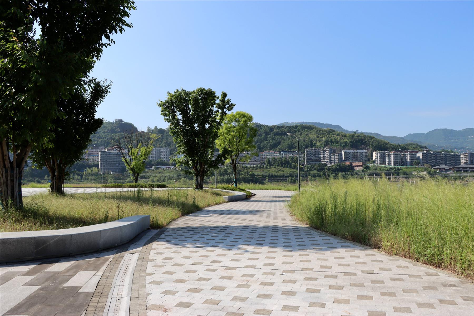 沿著籃球場,穿過雙江大橋橋底,就是人和街道唯一一個濱水市民廣場——立新廣場。新建步道隨著地形彎彎曲曲,黃桷樹、國槐等高大喬木點綴其中,形成了一片通透開放的濱水空間,這里既可滿足居民休閑娛樂的需求,又兼顧戶外運動的功能。