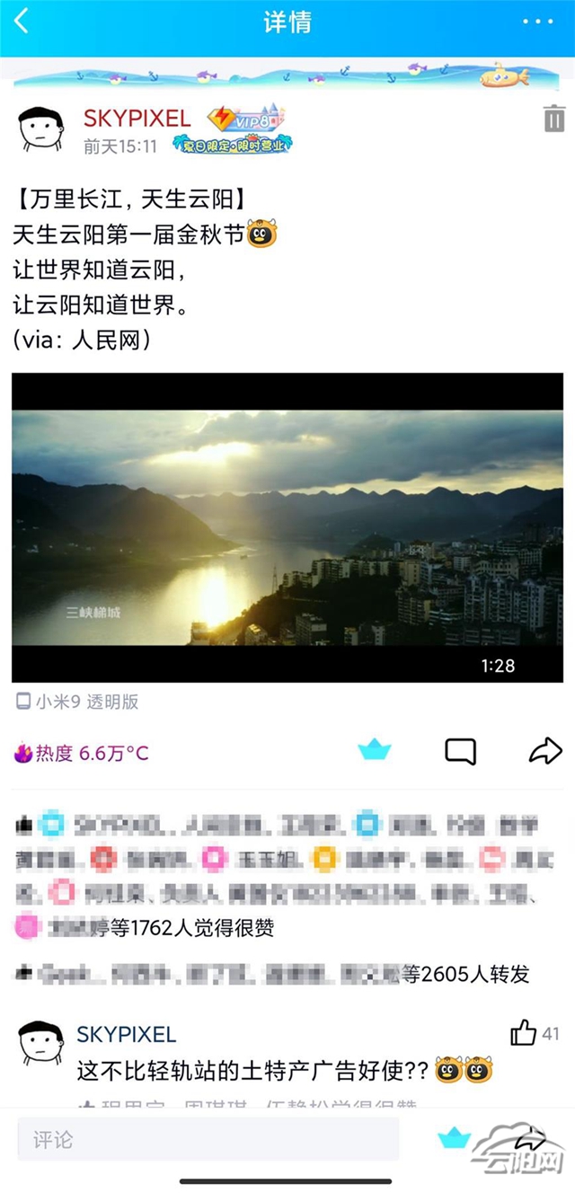 為了更好地” 讓世界知道云陽,讓云陽知道世界”,9月23日,一名在外求學的云陽籍學子,發布了一條附有文字和視頻的說說,短短兩三天時間,瞬間引爆了他原本安靜的QQ空間,獲得了 1762次點贊、2605次 轉發、6.6萬次瀏覽。