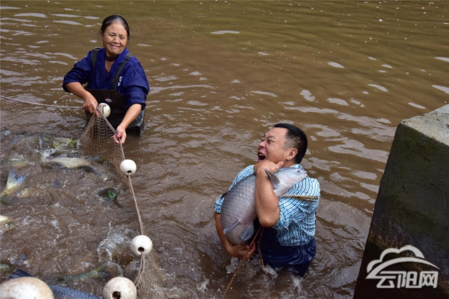 “這個大青魚有十多公斤喲,我抱都抱不住!”深秋時節(jié),在高陽鎮(zhèn)青樹村的水塘里,云陽縣漁公農(nóng)業(yè)開發(fā)有限公司總經(jīng)理溫定軍和村民正一起熱火朝天地網(wǎng)魚,網(wǎng)收緊后,肥美的大青魚、草魚、翹殼魚不停翻騰躍跳,引起水花四濺,溫定軍開心地抱起一條大青魚向記者展示。