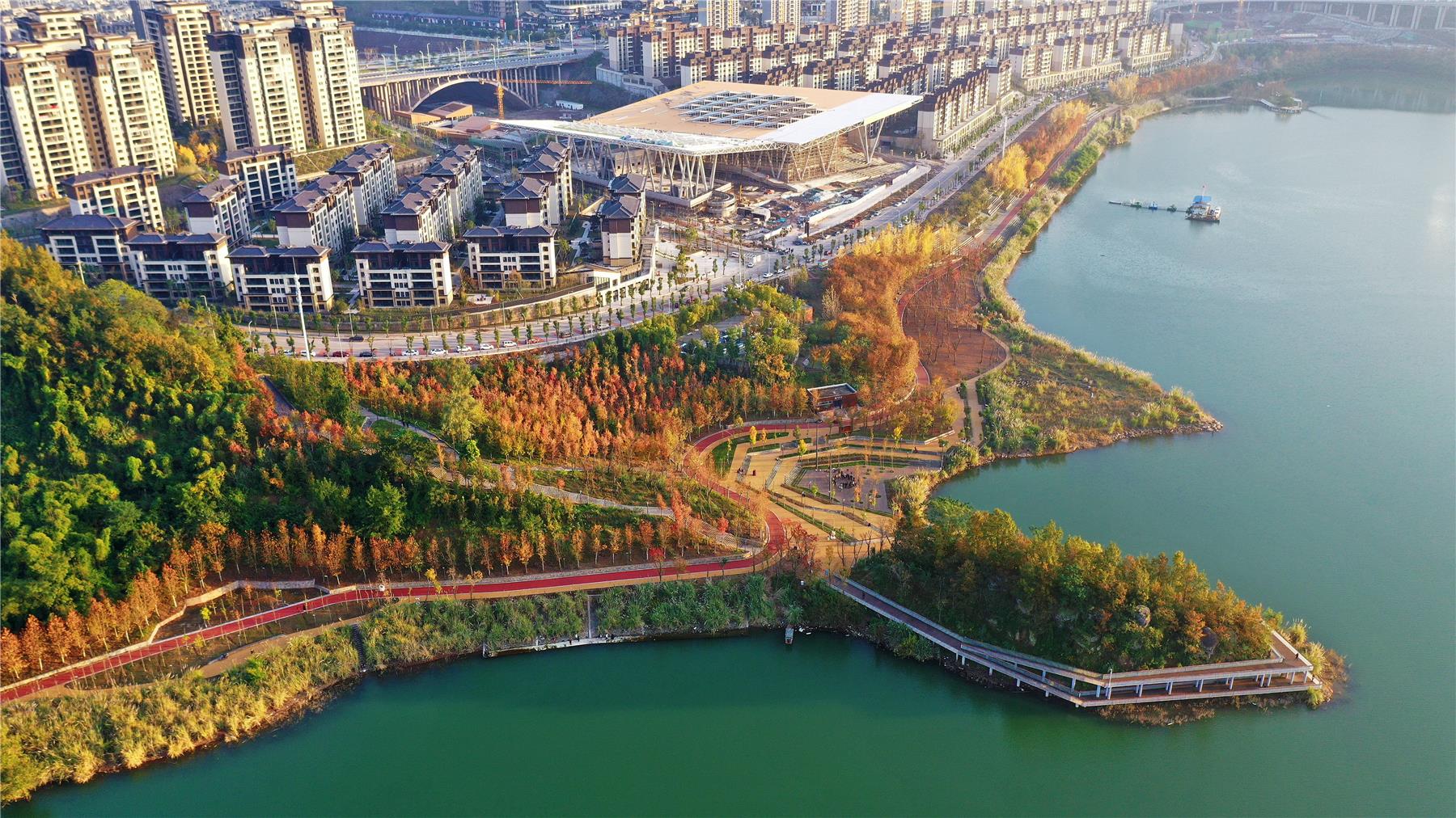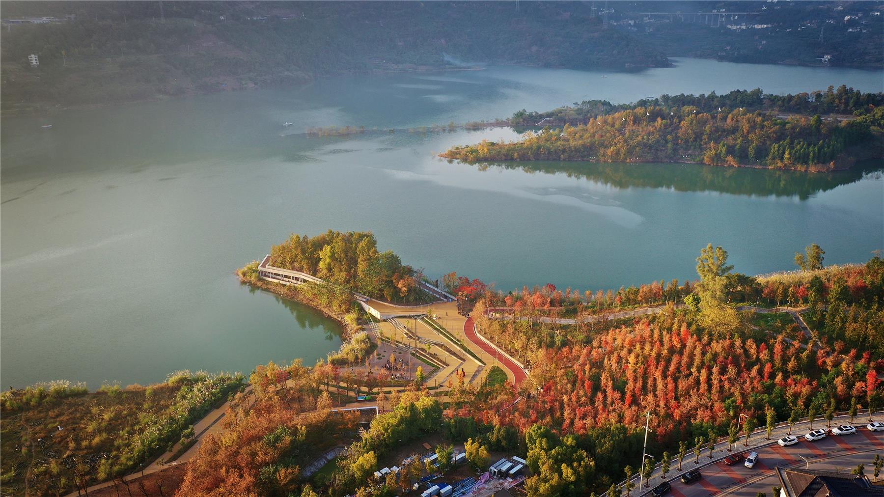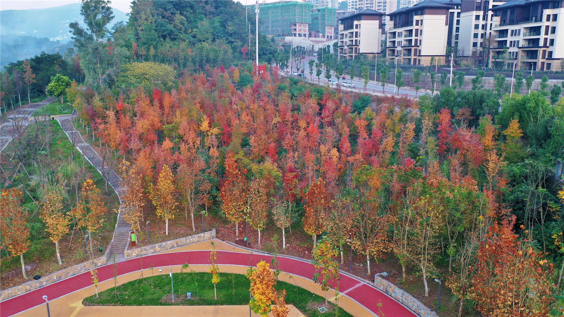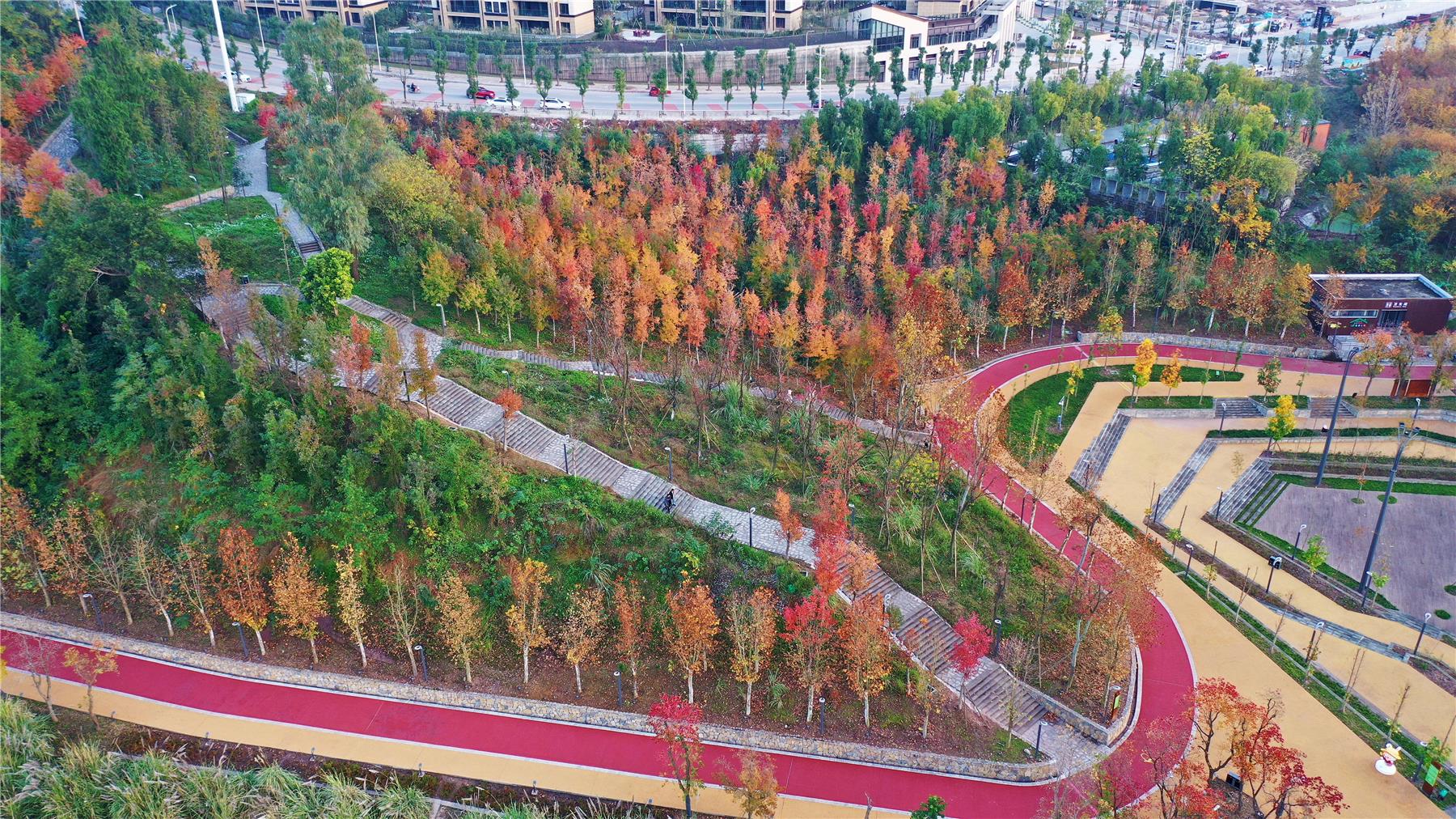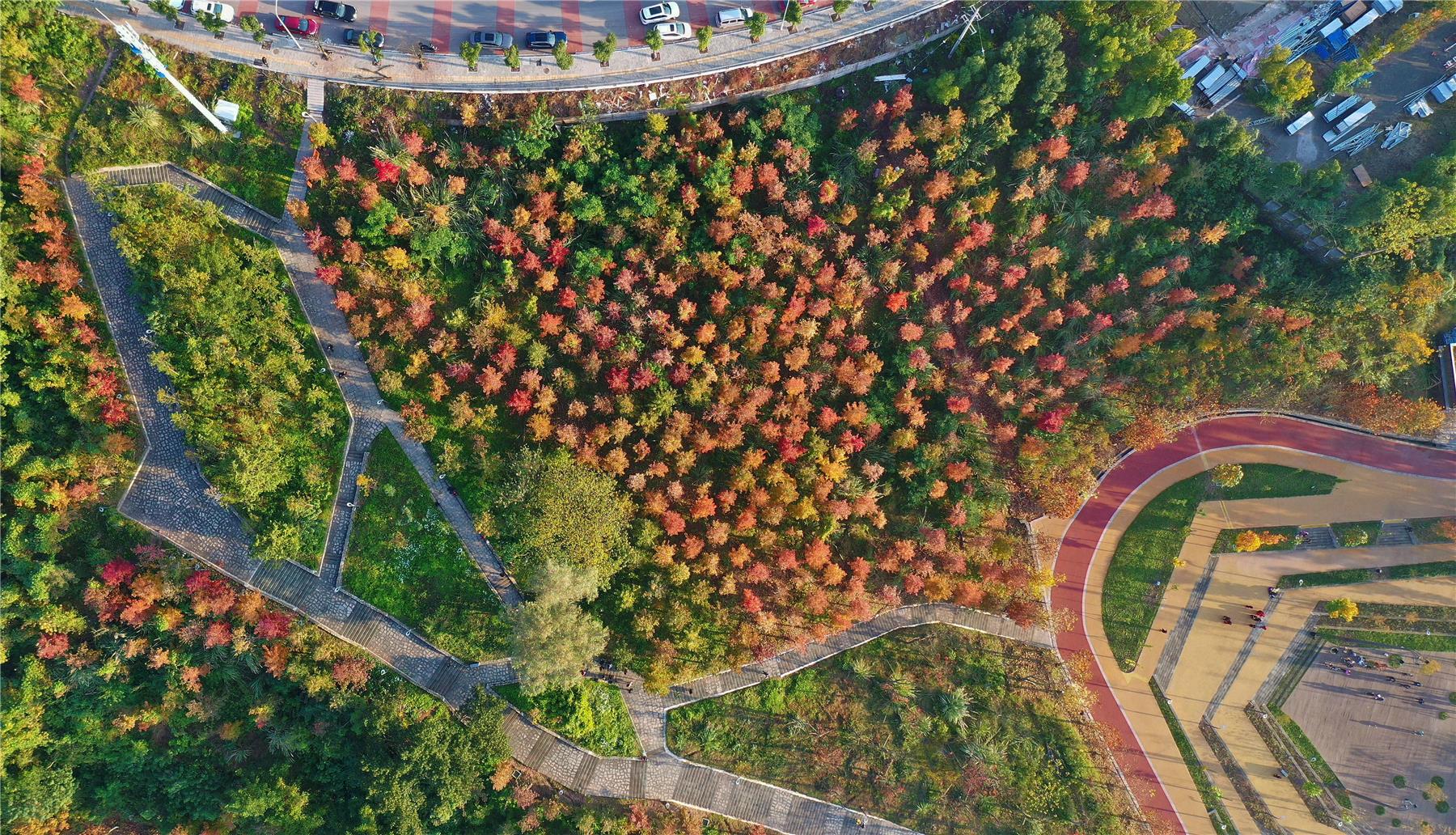 這段時間,隨著天氣放晴,白鷺公園的紅楓樹也迎來了最佳觀賞期。成片的紅楓、水杉等變黃或變紅,色彩斑斕,仿佛調色板被打翻。火紅的楓葉隨著步道、河岸綿延開來,在陽光的映照下,整個公園呈現出一片“紅葉爛漫 層林盡染”的迷人景象。(吳大維 攝)