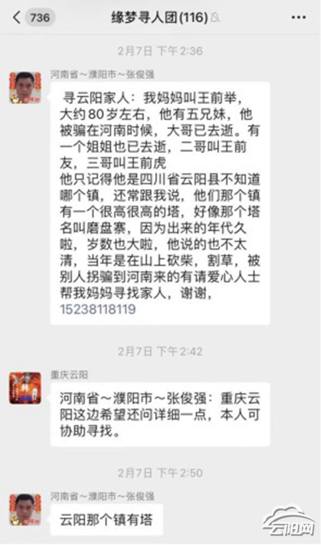 2022年2月7日,新年上班第一天。云陽縣救助站副站長、“緣夢尋人”重慶云陽尋親志愿者韓家新接到“緣夢尋人團”微信群中“緣夢尋人”河南志愿者老樂的一條“幫被拐媽媽尋找云陽家人”的尋親信息。