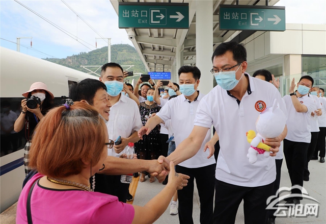 上午10時16分,從重慶西開往巫山的C6418列車準時停靠在云陽站。“云陽歡迎你們!”覃昌德一行等候在站臺上,熱情迎接到站游客,與大家親切握手,為他們送上“興云兔”,并合影留念。覃昌德說,云陽旅游資源豐富、人文底蘊厚重、生態環境優美、城市宜居宜業宜游,擁有龍缸、張飛廟、三峽梯城、岐山草原、環湖綠道等諸多旅游名片,是度假休閑的美麗之地。希望全國各地的游客朋友們乘坐高鐵來云陽走走看看,欣賞好山好水,品嘗特色美食,感受千年人文。