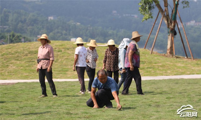 在外環大道其中的一處觀景平臺施工現場,二十余名工人在完成草坪基礎鋪設后,正頂著烈日繼續壓緊壓實草坪,確保草坪根部與地面土壤充分接觸。隨后工人還通過灑水車對草坪進行了全面澆灌,進一步提高草坪存活率。