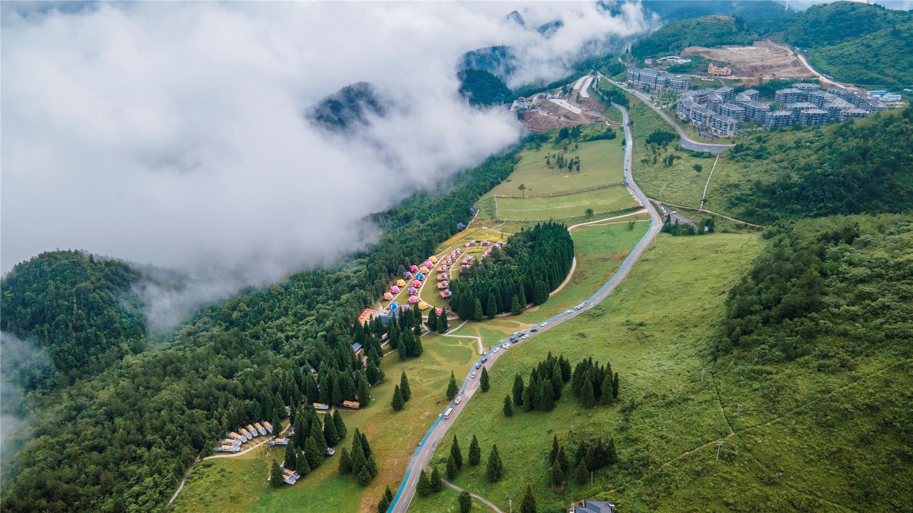 毗鄰龍缸,驅車十來分鐘,就可抵達歧山草原,高山、森林、草原是其最大特色。盛夏之際,可于此觀翠巒如波、云霧如海;春秋時節,可于此賞山花爛漫、姹紫嫣紅。今年剛高中畢業的學生周鑫,此次專為造型別致的草原漁船、泡泡屋、星空房而來。