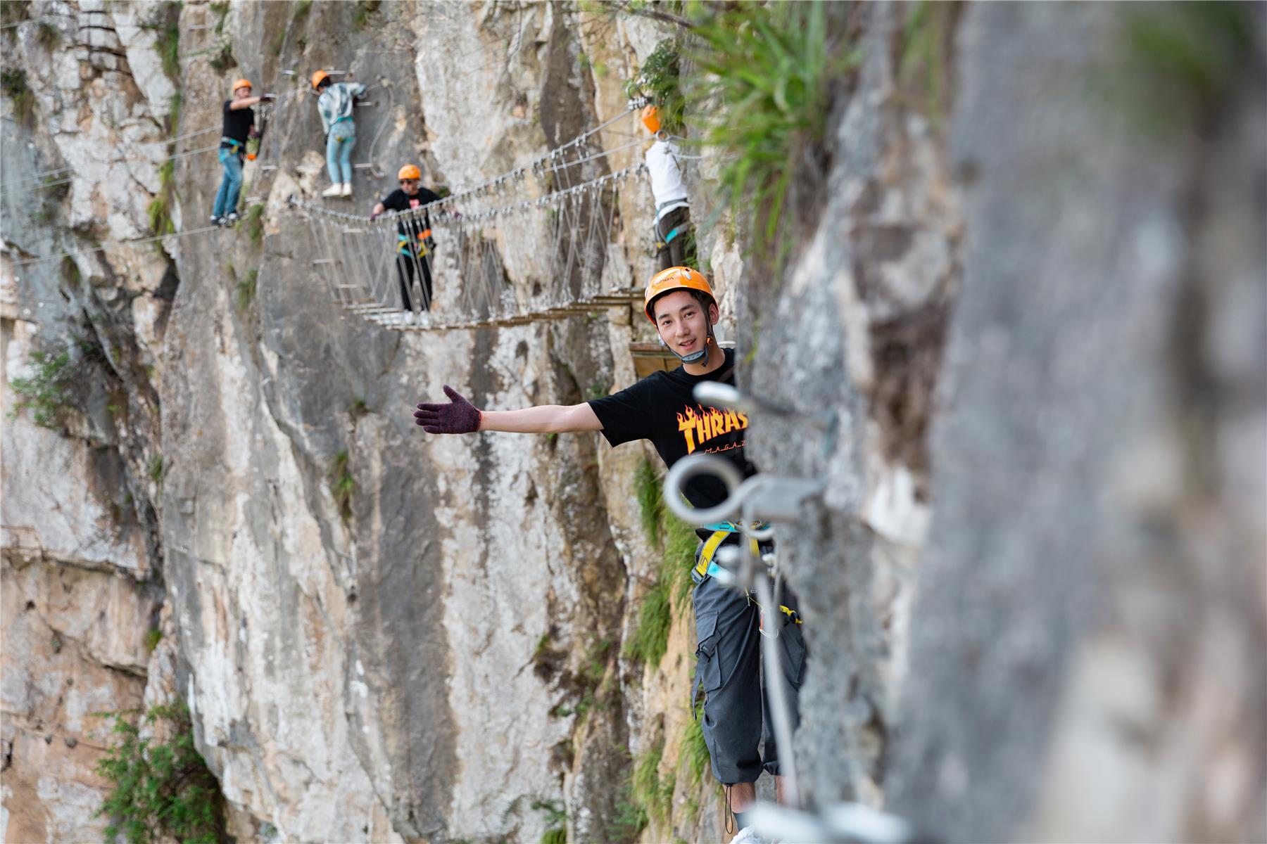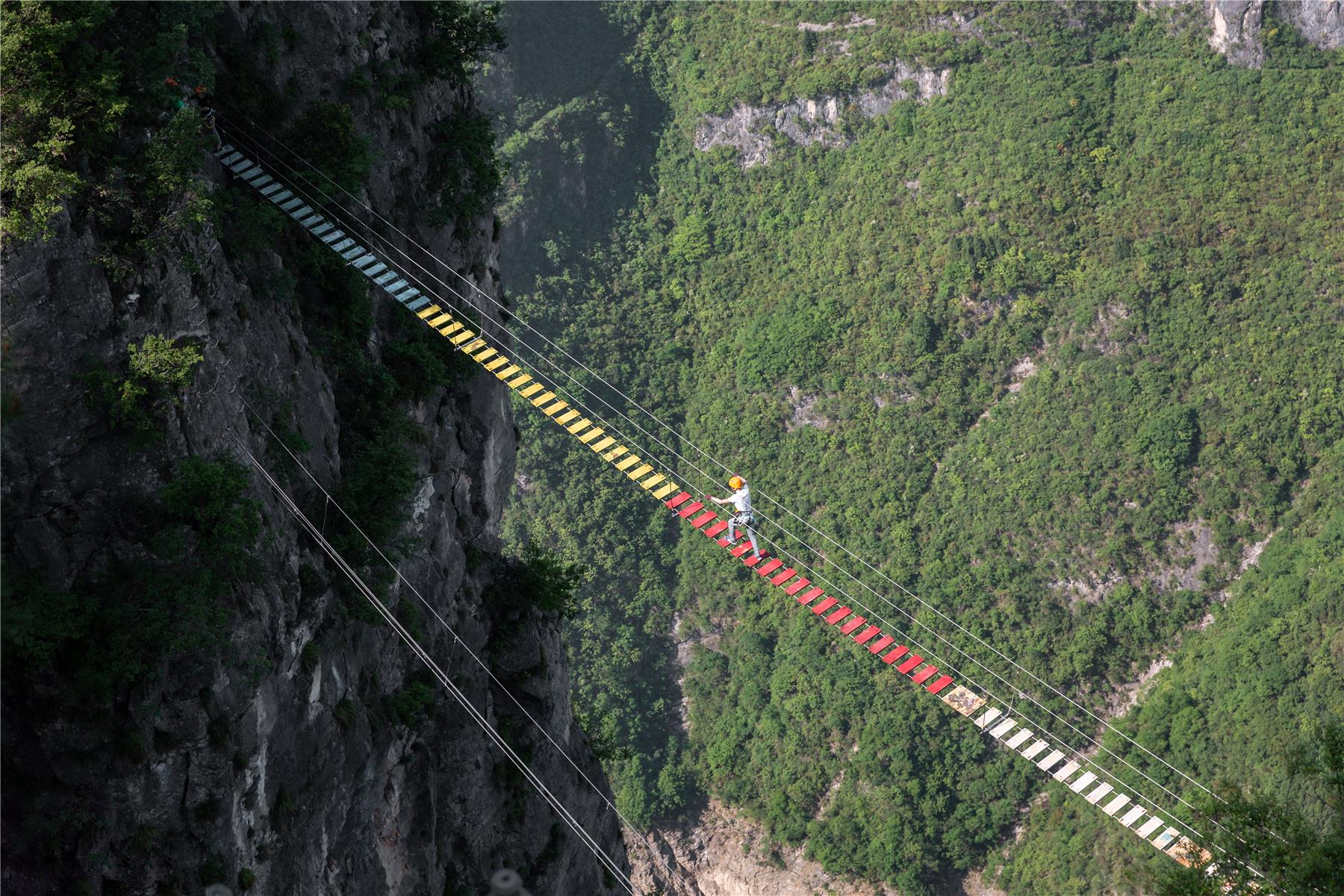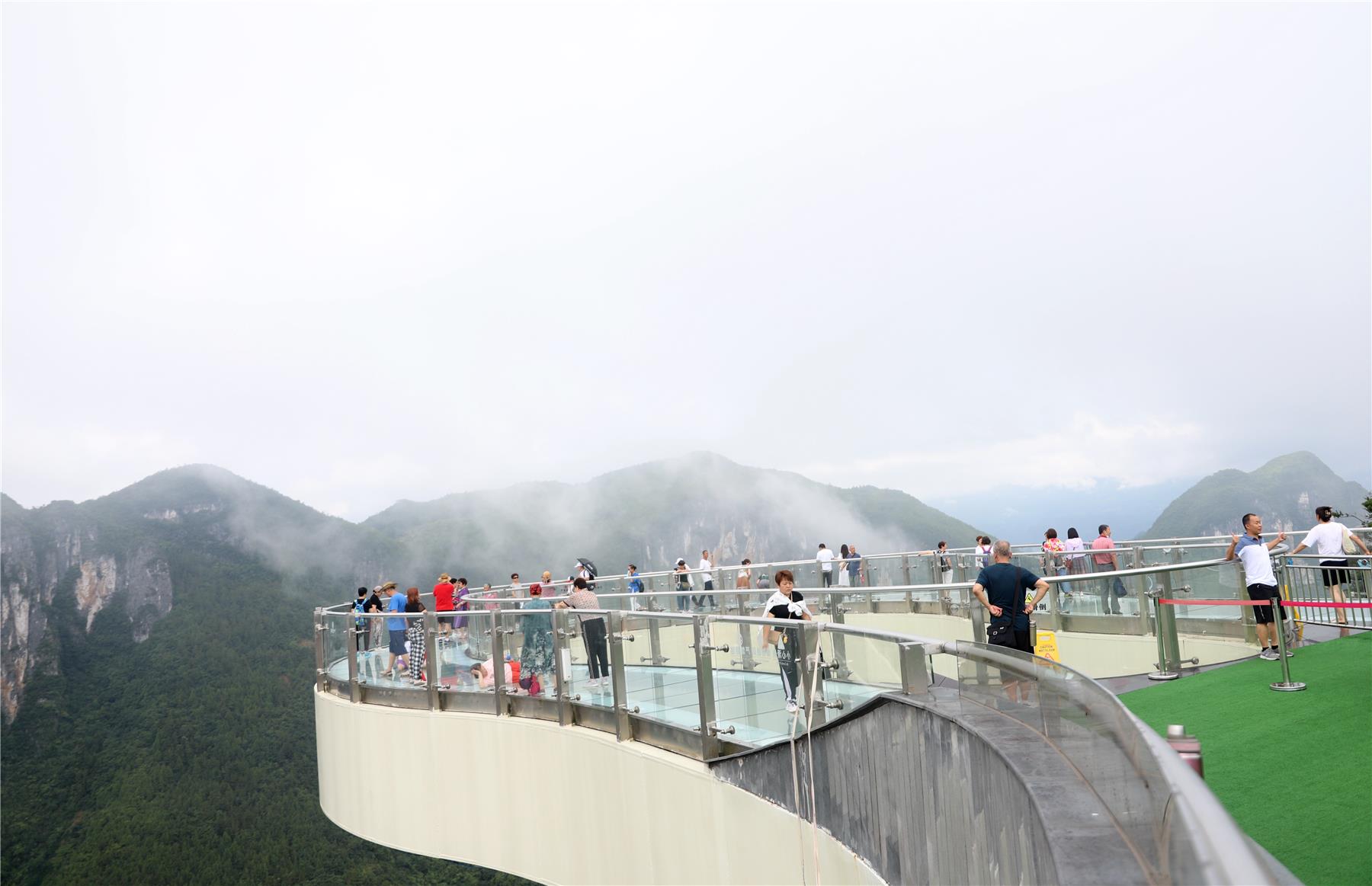 來到千米之巔的云端廊橋,一大批游客正站在廊橋上,腳踩山水絕壁、頭頂白云藍天,感受“直窮絕頂高,始覺天地闊”的豁然開朗,并爭相拿出手機或相機拍照合影。