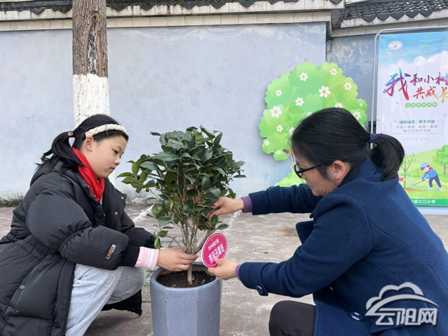 “小心點兒,別把花盆弄翻了?!薄坝檬职淹翂簩嵑笤贊菜??!边x種、買盆、運土、提水……孩子們在校內植樹區域親手種下班級樹,并給班級樹命名掛牌。主題隊會結束后,各中隊學生代表帶上提前準備好的器材,來到學校操場,參與全班同植一棵樹,全校共護一片綠活動。