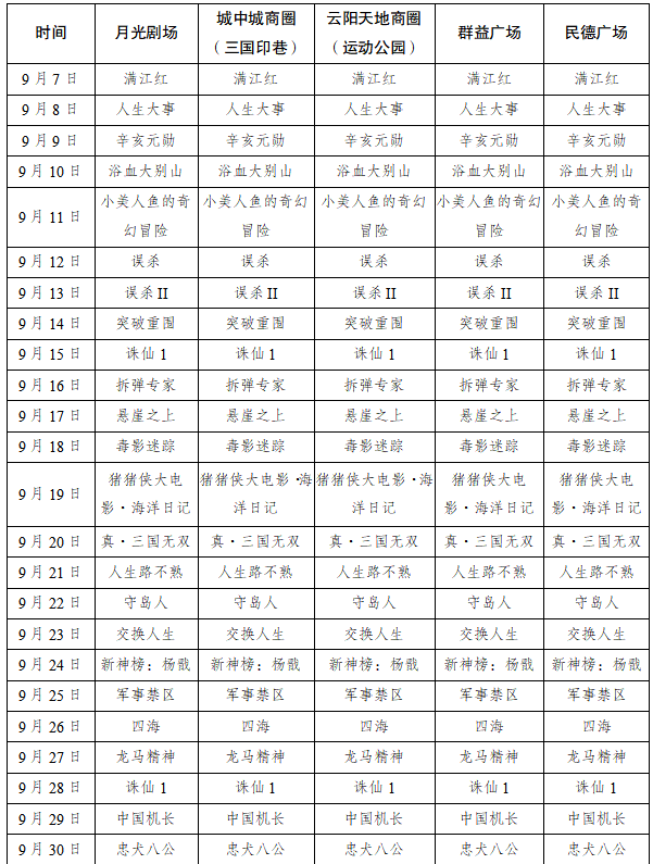 注:下雨天,放映取消!市民朋友們別跑空喲!