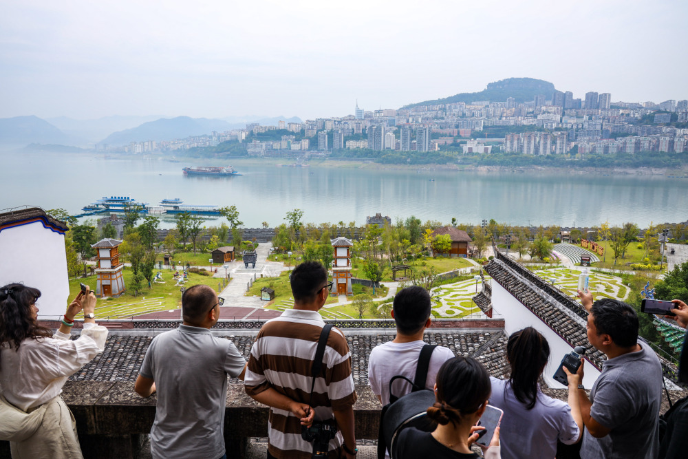 ▲9月11日,采訪團在張飛廟中欣賞江景。記者 尹詩語 攝/視覺重慶