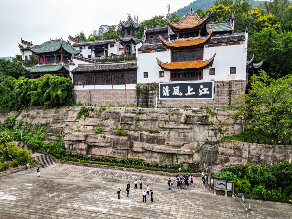 張飛廟雄踞長江南岸巨崖之上。清末著名書法家彭聚星手書的“江上風清”四個大字高懸在面江廟壁上,更增添了廟宇莊嚴肅穆的氣勢。