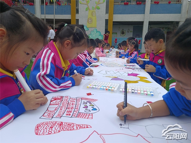 活動當天,幼兒園舉行了升旗儀式,伴隨著《義勇軍進行曲》故幼全體師生隊列整齊,行注目禮,小朋友們稚嫩的眼神中全是對祖國媽媽濃濃的愛意與敬意。為表達敬愛之情,孩子們為祖國獻上了愛國詩歌朗誦《少年中國說》、《歌唱祖國》紅歌大合唱、“童心向黨,喜迎國慶”百米畫卷,孩子們手握畫筆在百米長卷上揮灑潑墨,埋頭作畫,畫出的是一幅幅色彩斑斕、童趣盎然的圖畫,傾注的是孩子們對祖國媽媽無盡的愛意。
