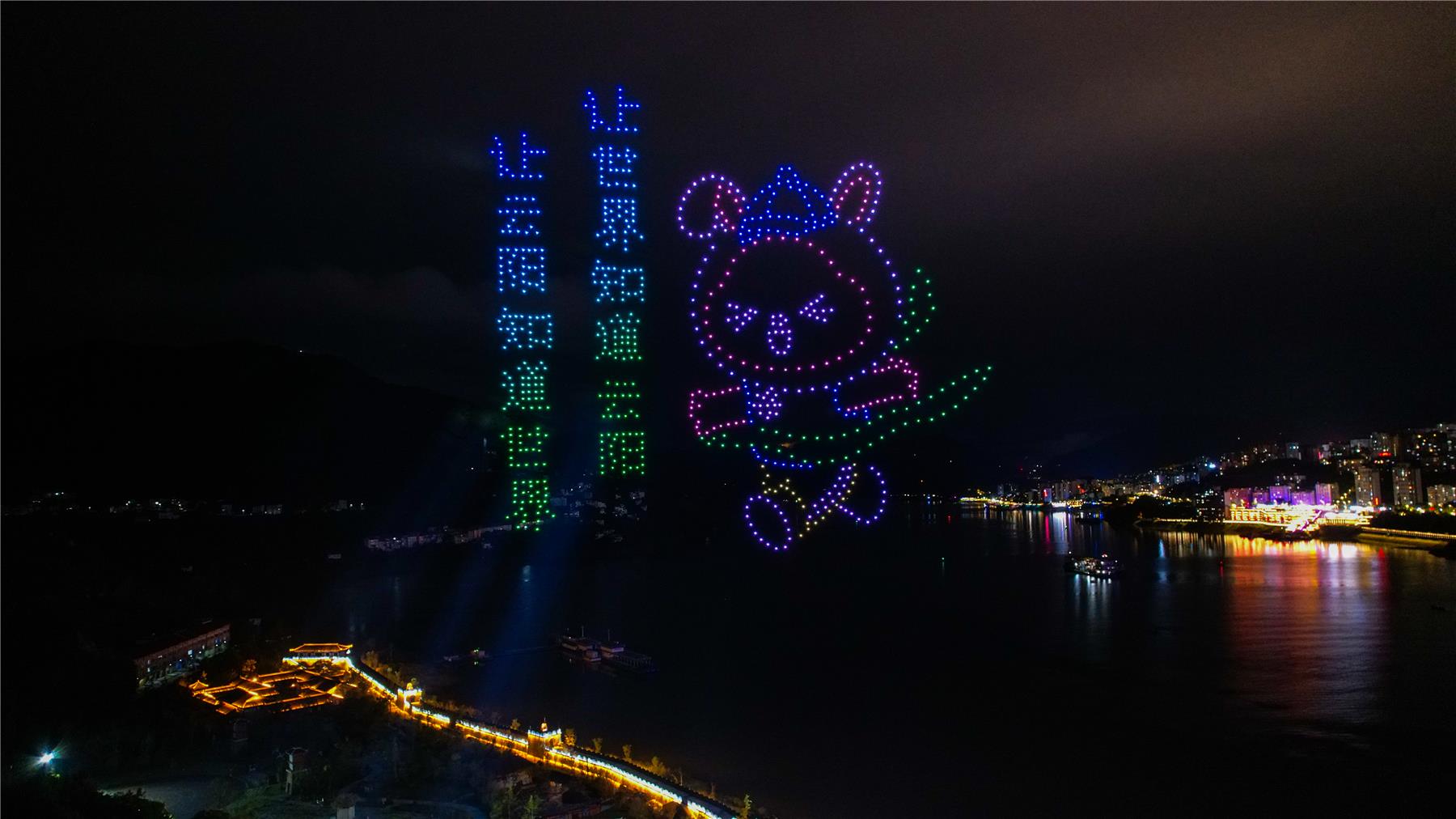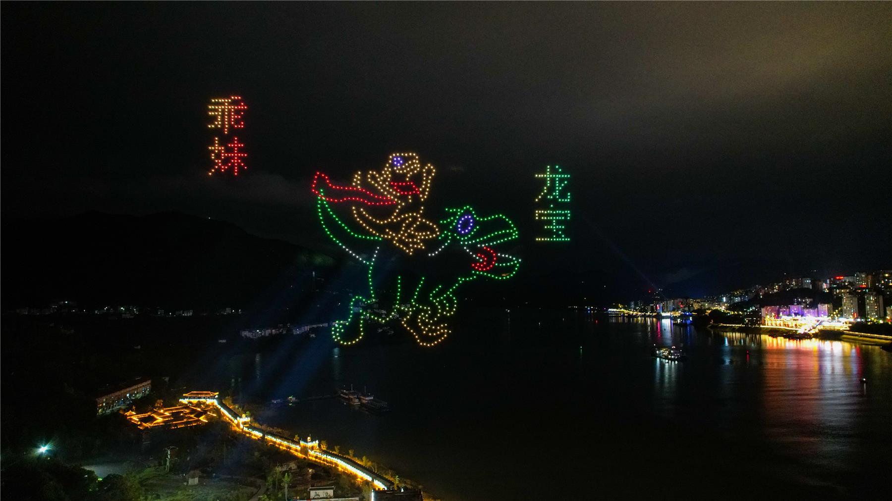 此次無人機編隊表演還結合“全域旅游”主題,組成“云陽城市形象IP“興云兔””、“云陽恐龍IP形象“龍寶”、“乖妹””“天下龍缸 千年張飛廟”“黎明古村”等充滿地域文化特色的創意畫面,與城市夜景交相輝映,尤其是江與城遙相呼應,在江面蕩起層層煙波,如夢似幻,閃耀在三峽庫區夜空,吸引了大量游客和市民駐足觀看,讓人沉醉其間。“無人機表演展示了張飛廟、天下龍缸等風景,很符合云陽當地的一個特色,能夠感受到云陽獨特的地域文化。”成都游客昝思思說。
