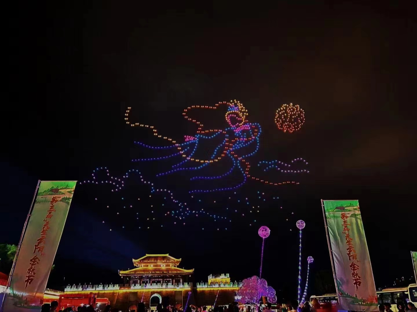 月滿人間,燈火盈天。9月28日晚,在重慶市云陽縣第三屆“天生云陽”金秋節——首屆長江國際華服藝術展上,800架閃爍著五彩燈光的無人機飛上夜空,變幻出絢爛的造型和標語,向人們傳遞著中秋、國慶的祝福。
