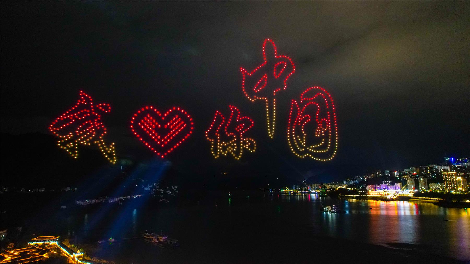 天空為幕,燈光為筆。晚上9點鐘,在長江之畔的張飛廟景區,無人機編隊表演在細雨蒙蒙中正式開場,800架無人機如夜空中的螢火蟲,匯聚成多彩的造型,點亮長江兩岸。在統一的指揮下,無人機編隊隨著燈光布陣交錯起落,在夜空中不停變換隊形,組成“嫦娥奔月”、“詩意長江 華韻中國”、“我愛你 中國”等圖案,慶祝國慶和中秋佳節的到來。