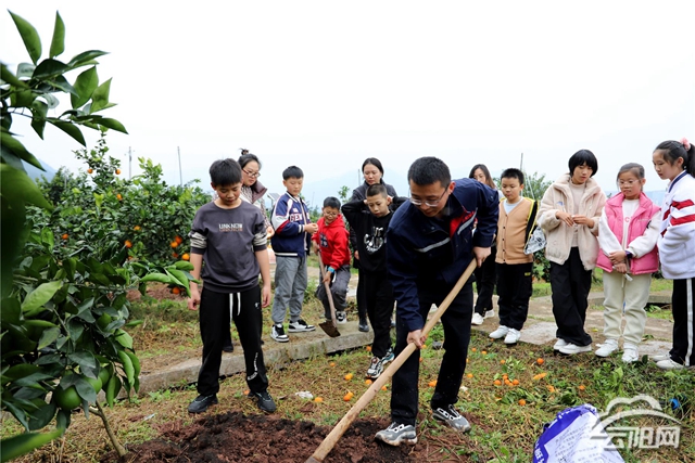 “小朋友們,你們知道柑橘是屬于什么科嗎?”“我們種柑橘樹的時候要先在坑的周圍撒上肥料。”活動中,技術人員為學生講解了柑橘的種類、生長條件以及種植要領。揮鍬鏟土、扶正樹苗、填土夯苗、提桶澆水……在學生和家長的共同協作下,一棵棵柑橘樹很快就安上了“新家”。