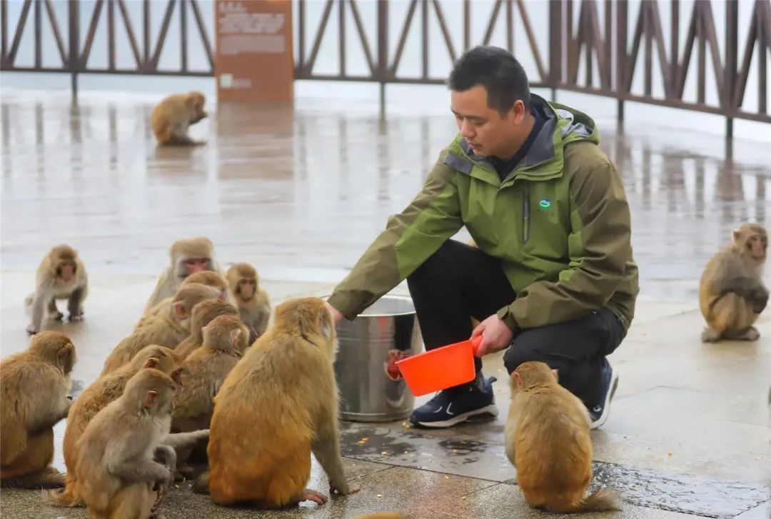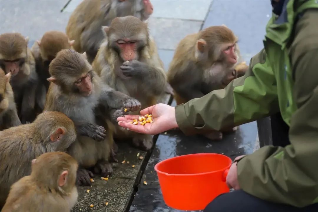 “我們針對猴子習(xí)性,在戲猴臺這個地方設(shè)置了三到四個投喂點,采購了一批玉米、紅薯、水果之類的食物,每天不定時的進(jìn)行三四次投喂,讓它們溫暖過冬。”萬顯軍介紹,在雨雪天氣,他們會對猴子進(jìn)行大量投喂,保證它有足夠的體力。