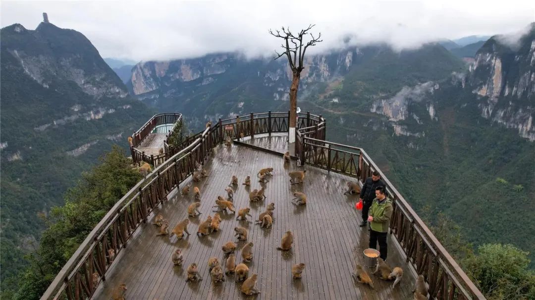 成群的野生獼猴每天來龍缸景區(qū)覓食