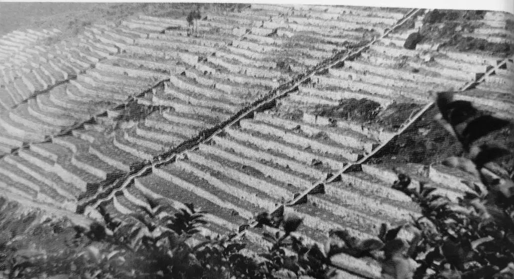 鑿出坑來,土不夠。林場人把沖下山坡的土從沉沙凼中挑回,或是就近搬運積攢的土來填。坡陡,光靠人效率低,要騾子幫幫忙。但這騾子怎么上山?林場人自己修了一條綿延十公里的騾馬路,方便騾子上山。這崎嶇不已的騾馬路經過歲月洗禮,如今還能尋著點痕跡。