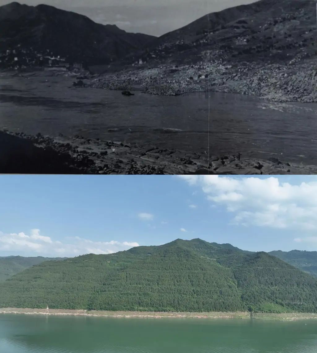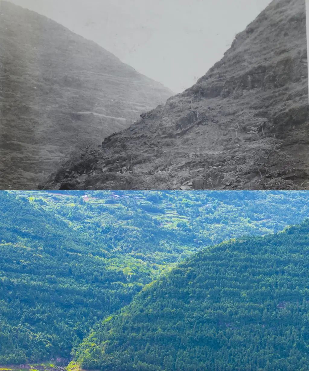 △ (上)上世紀六七十年代,長江兩岸巖石裸露。云陽縣檔案館供圖(下)如今的長江兩岸,已被茂密的森林覆蓋。云陽縣林業局供圖