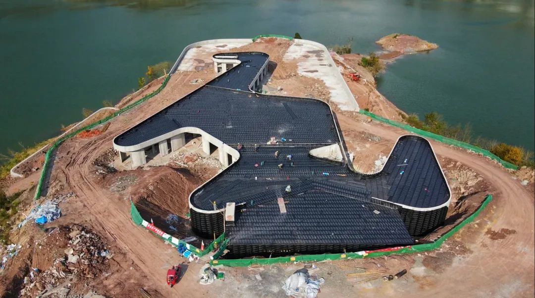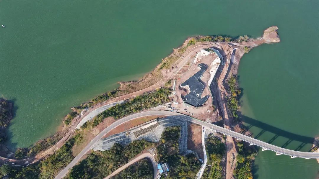 始建于2022年11月的東部游客接待中心已初具雛形,即將進行內(nèi)部裝修和園建,空中俯瞰其主體建筑群,猶如一只行走在河畔的可愛恐龍。