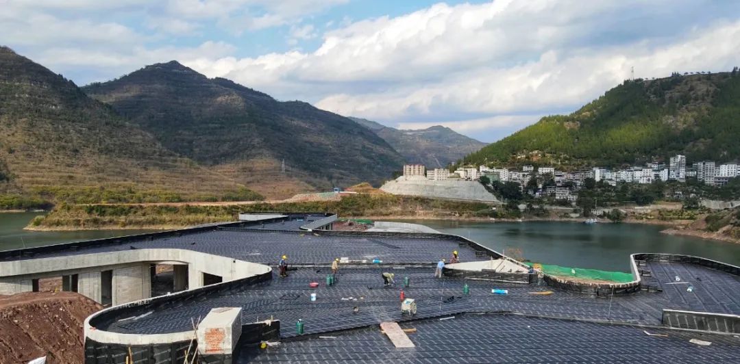 年末歲尾,來到云陽恐龍國家地質(zhì)公園,各節(jié)點施工現(xiàn)場依然是一片繁忙的施工景象。在位于普安鄉(xiāng)豐河村的東部游客接待中心,20多名工人正抓緊進行屋面防水層施工。