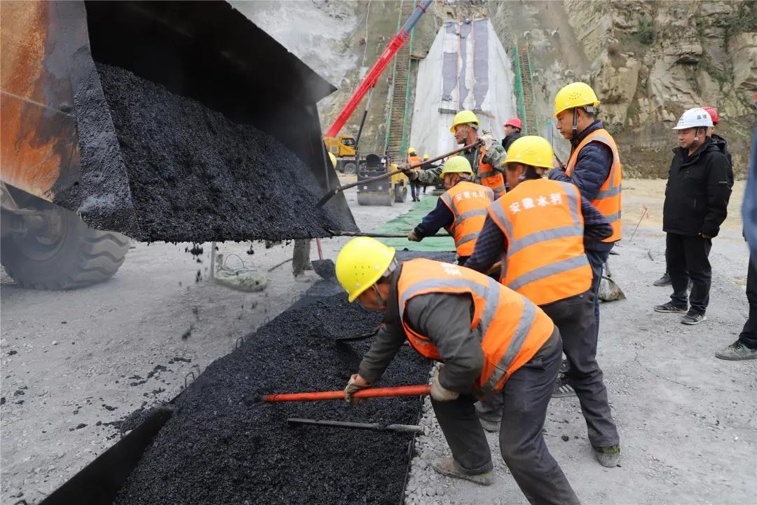 走進施工現場,施工檢測人員正對出機口溫度及入倉的瀝青混凝土溫度反復測量并記錄,確保滿足規范及攤鋪試驗要求,再由工人們完成瀝青攤鋪……