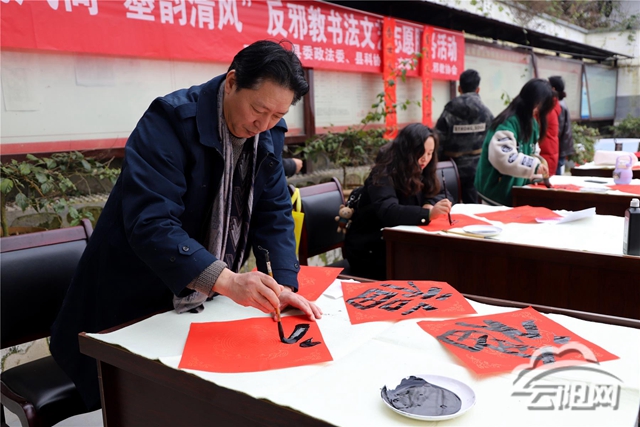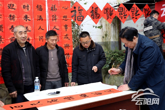 云陽網(wǎng)訊(記者 張揚(yáng)鳳)1月30日,縣文聯(lián)組織文藝志愿者到龍角鎮(zhèn)開展新春送春聯(lián)文化下鄉(xiāng)活動,現(xiàn)場為當(dāng)?shù)厝罕姇鴮懘郝?lián)和“福”字,贈送一份新年祝福。