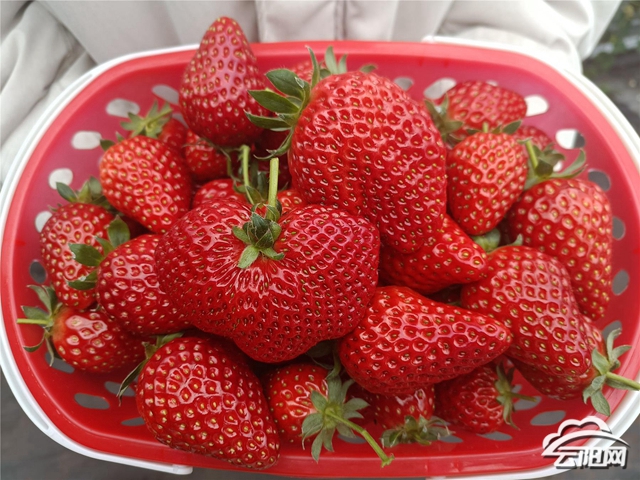走進大棚內,清甜的果香撲面而來,只見所有的草莓并不是長在田壟上,而是栽培在一排排一米余高的鋼架上。一顆顆粒大飽滿的草莓泛著讓人垂涎欲滴的光澤,煞是喜人。
