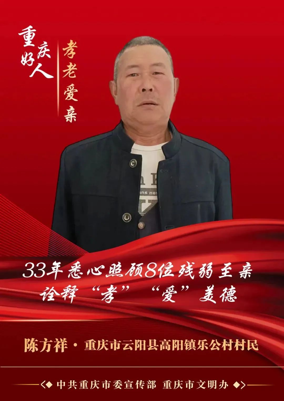 陳方祥,男,1958年10月生,重慶市云陽縣高陽鎮樂公村村民。1990年以來,陳方祥悉心照顧體弱多病的父母,用心陪伴中年喪偶、老年喪女的岳父,他白天忙生產,晚上床前盡孝,喂藥喂飯、端屎接尿、擦身子等,讓三位老人安度晚年。