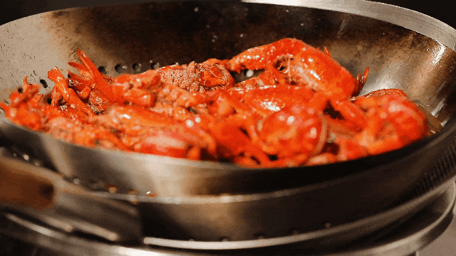 正式開炒,將蔥、姜、辣椒、花椒等香料爆香,倒入過油后的小龍蝦混合翻炒,再加入高度白酒去腥增香,最后倒入啤酒和其他調料,顛鍋翻炒,燒燜入味,湯汁翻滾中,香氣四溢,美味即將誕生。