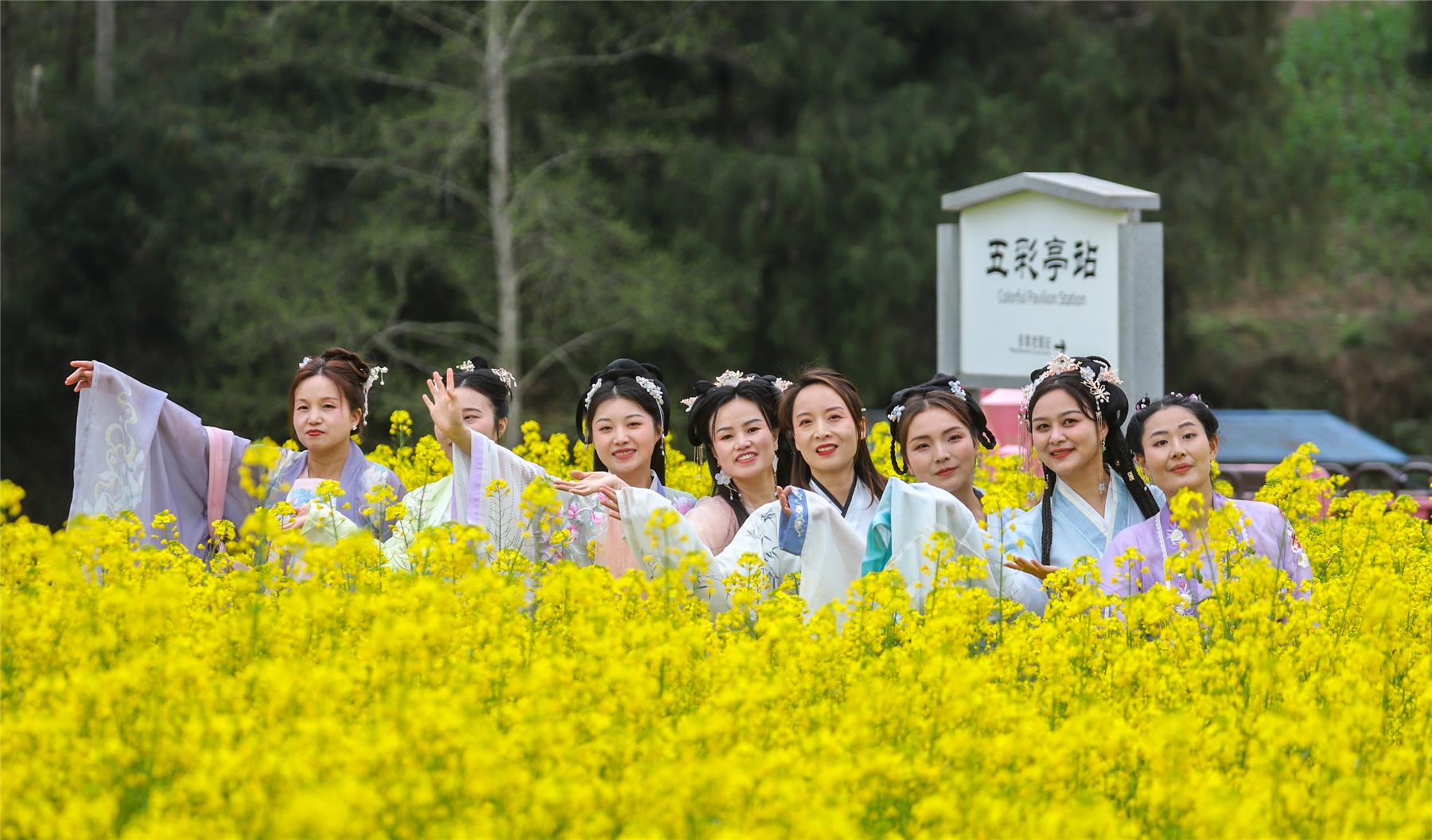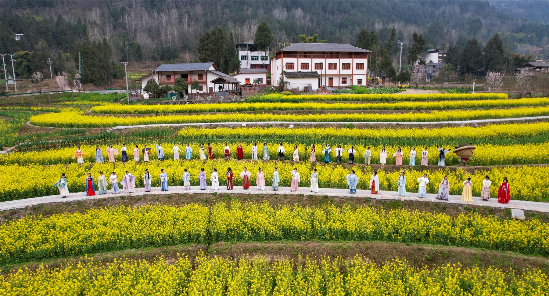 走進黎明古村,油菜花田在風中輕輕搖曳,如一片金色的海洋,充滿了生機與活力。女教師們淡描娥眉,淺施粉黛,云鬢高挽,步搖輕顫、笑顏如花。曼妙多姿的她們,穿梭在花海中,與金黃的油菜花海交相輝映,形成了一道亮麗的風景線。一顰一步自成風景,千嬌百媚盡顯風采,既演繹了中國傳統服飾之美,又展示了東方女性賢淑、典雅的氣質。“著我漢家衣裳,興我禮儀之邦。我們身著華服來到花田走秀踏青歡度三八婦女節,展現我們新時代女性的自尊、自立、自信、自強,發揚優秀的傳統文化。”云陽縣教育委員會辦公室工作人員范燃新說。