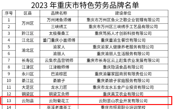 “云陽菊花工”是依托云陽蕓山農業開發有限公司旗下的三峽陽菊品牌而打造的云陽特色勞務品牌。該公司堅持以三峽陽菊為品種,以三峽陽菊為品牌,開發了菊花系列產品,延伸了菊花產業鏈條。