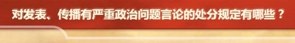 《中國共產(chǎn)黨紀(jì)律處分條例》第五十條、第五十一條、第五十二條對(duì)發(fā)表、傳播有嚴(yán)重政治問題的言論行為列出負(fù)面清單,目的是嚴(yán)格規(guī)范黨員言論,以嚴(yán)格的紀(jì)律處分規(guī)定保障四項(xiàng)基本原則、改革開放決策、黨中央大政方針貫徹落實(shí),維護(hù)黨和國家形象,維護(hù)黨和國家領(lǐng)導(dǎo)人威信,維護(hù)英雄模范形象,堅(jiān)決反對(duì)歪曲黨的歷史、中華人民共和國歷史、人民軍隊(duì)歷史的行為,維護(hù)黨的團(tuán)結(jié)和統(tǒng)一。發(fā)表、傳播有嚴(yán)重政治問題的言論行為主要有以下幾類: