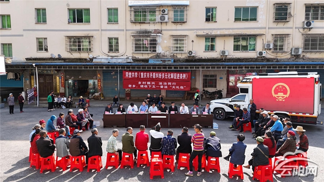 在龍塘社區的居民廣場,重慶市高法院派駐龍塘社區第一書記楊平為現場群眾解讀《重慶市矛盾糾紛多元化解促進條例》,縣人民法院工作人員通過“車載便民法庭”播放鄉村振興法治同行宣傳片,向周邊社區居民宣傳普及法律法規。現場還設置有咨詢臺,為群眾講解婚嫁彩禮、贍養老人、追索勞動報酬、借貸糾紛等當前農村法律熱點問題方面的知識,并解答群眾的咨詢提問,還向周邊居民派發法律法規宣傳冊100余冊。
