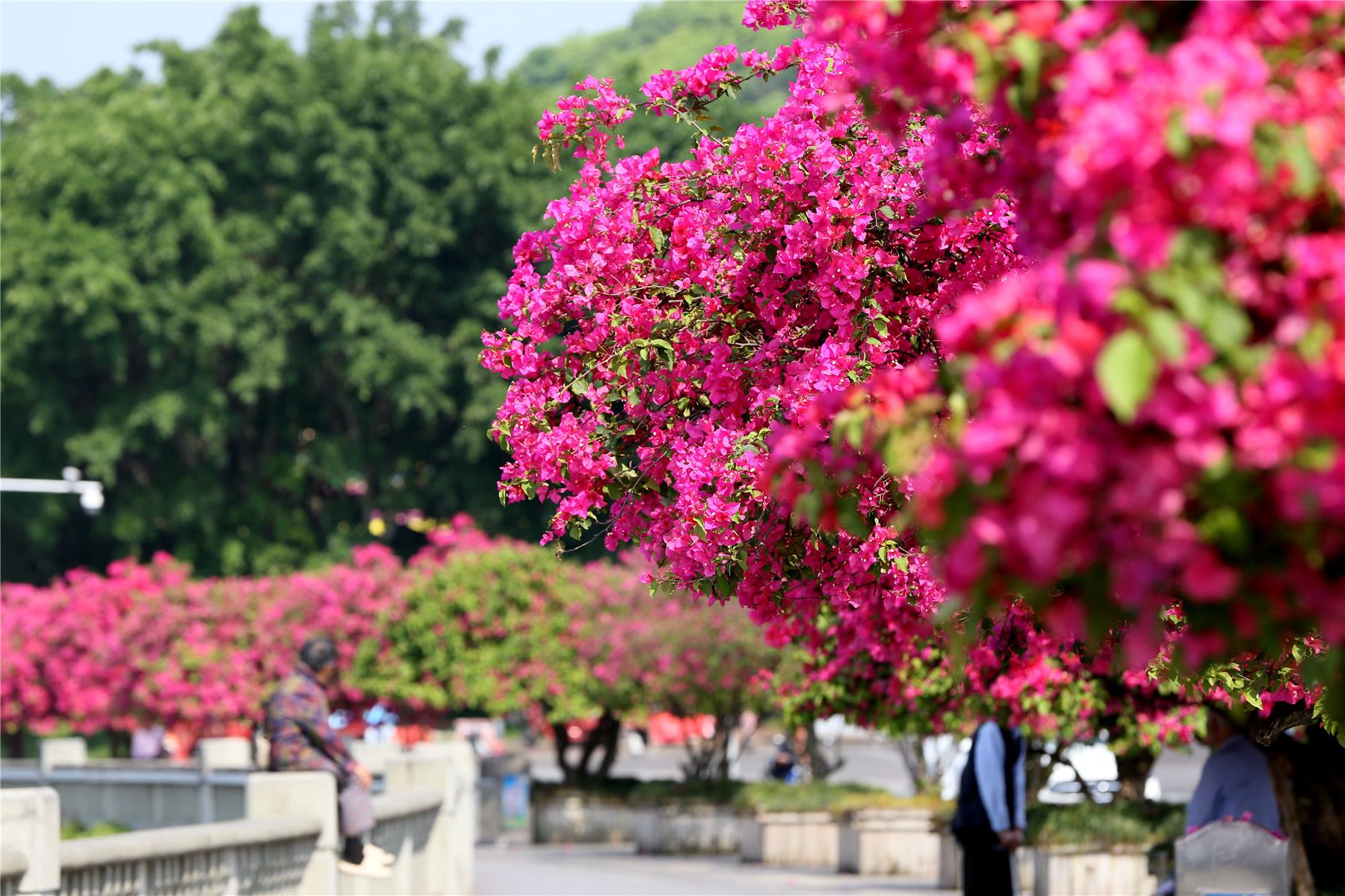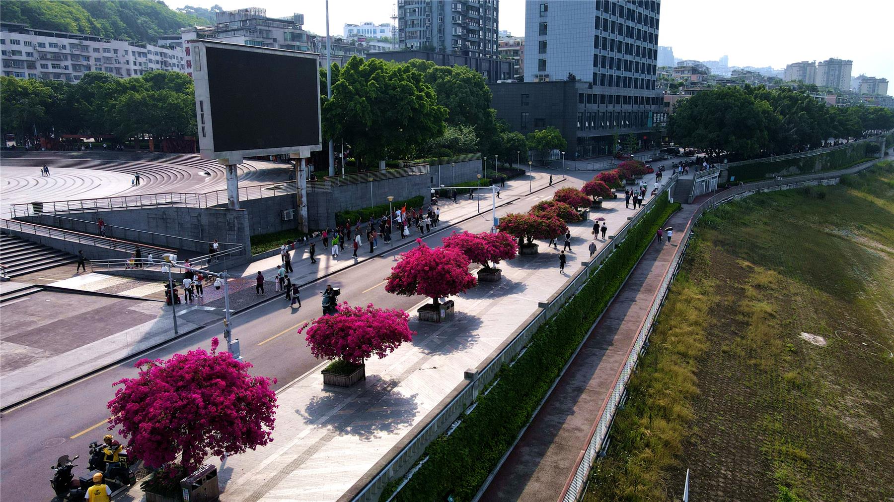 在兩江廣場,放眼望去,成排的三角梅熱情綻放,開得花團錦簇。走近細細觀賞,有的恣意怒放,隨風輕輕搖曳,燦若云霞;有的含苞待放,簇擁在一起,層層疊疊。從空中俯瞰,沿路盛開的三角梅宛如披在江邊的一條彩帶,與青山綠水相映成趣,成群的游人穿行其間,令人流連忘返。