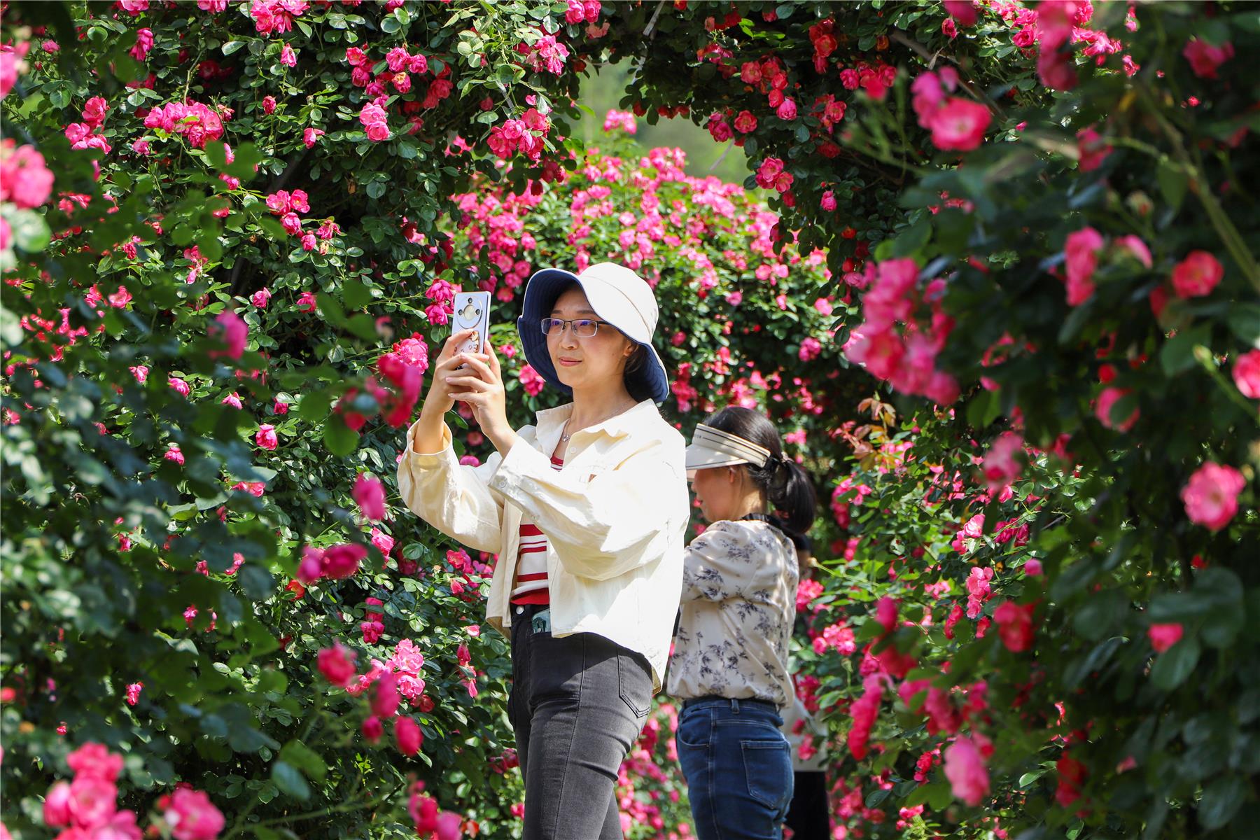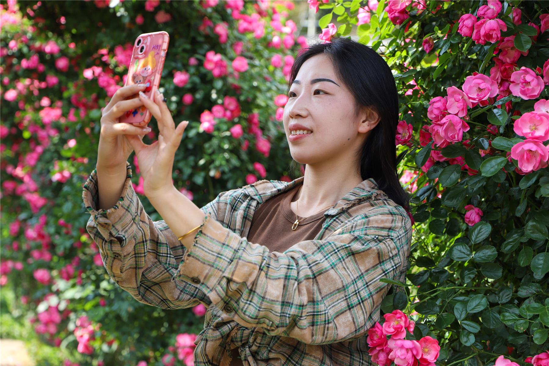 在吉慶村田園綜合體景區內,只見朵朵薔薇花開得正艷,微風拂過,好似一抹粉色的花海,大紅、粉紅的花朵在枝頭爭奇斗艷,綠葉蔥蘢,枝蔓垂掛,與藍天、白云、村舍相映成趣,小徑旁,一簇簇薔薇花隨風搖曳,美不勝收,吸引不少村民駐足觀賞、拍照留念。