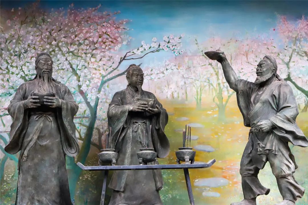 劉、關、張桃園三結義的雕塑面江而立