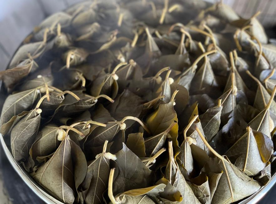 精選大米做原料,用石磨磨碎;將打好的米粉(米的粉末)和面粉按照比例,加入適量白糖、酵母和山泉水,手工揉和成合適的狀態(tài),靜置1-3小時(shí),清洗桐葉后包粑,然后蒸粑起鍋。經(jīng)過(guò)挑選大米、磨粉、發(fā)酵、挑葉、清潔、包粑、蒸粑、起鍋等工序制成的桐葉粑清香爽口,綠色健康。