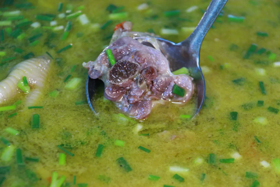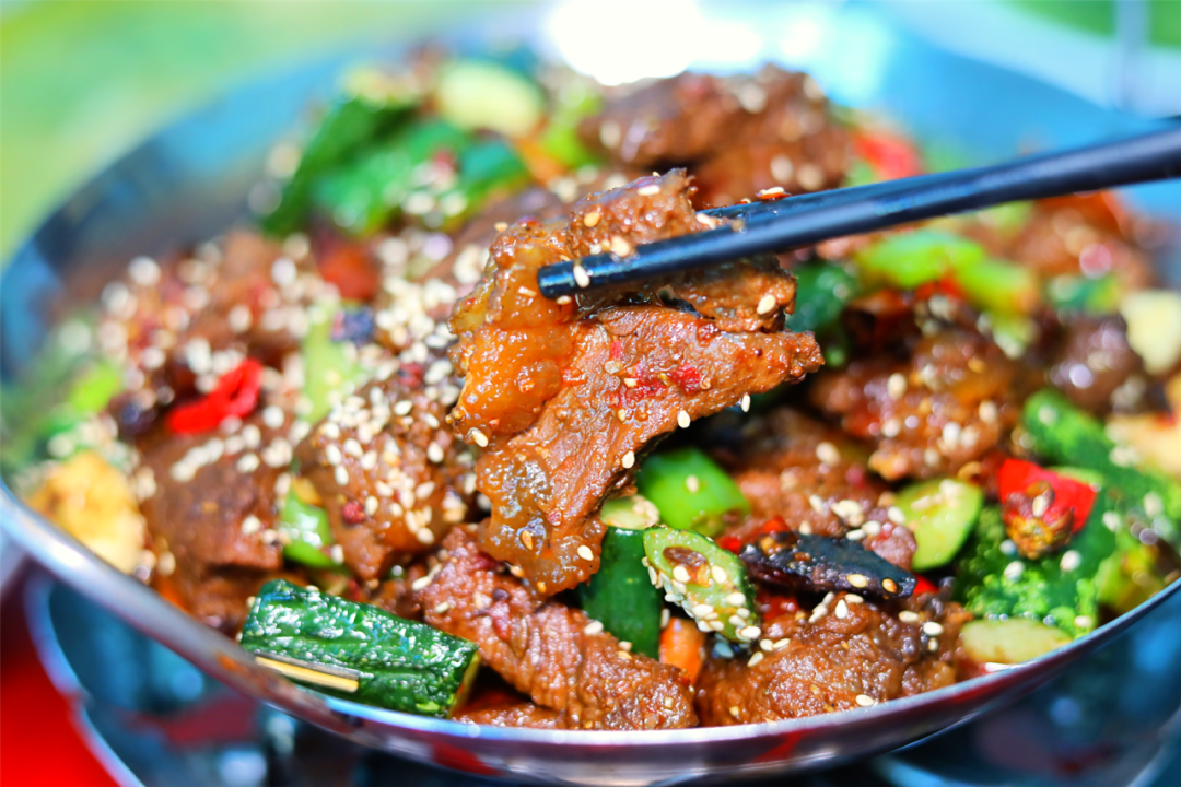 牛肉、牛雜,搭配糟辣椒、青紅椒、芹菜、黃瓜等共同炒制而成,使牛皮入口即化,牛肉的嚼勁充分詮釋出來,再加上蔬菜的爽口和內雜的點綴,是一道不可多得的下飯下酒菜品。